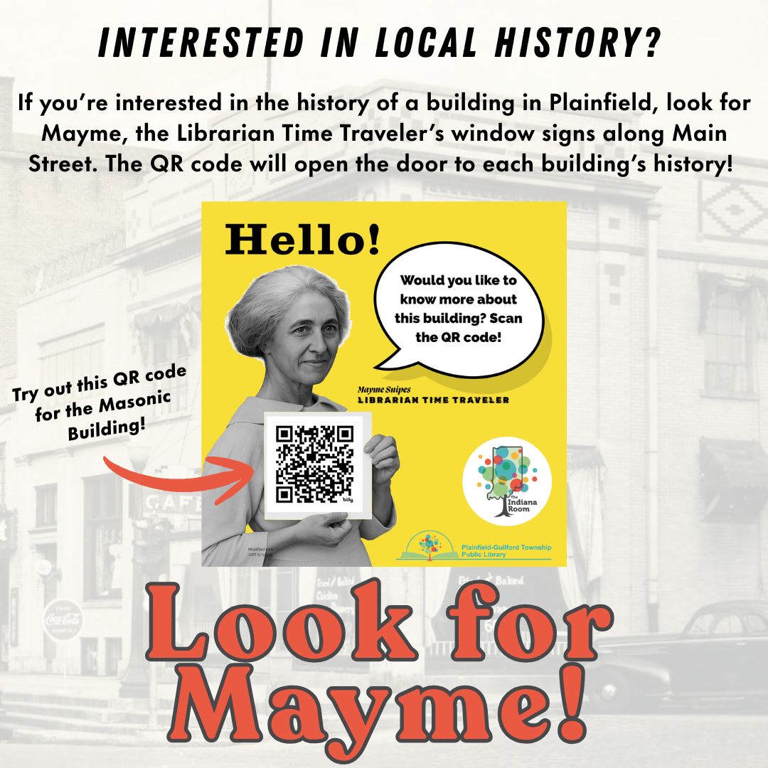 Keep an eye out for Mayme Snipes, Time Traveling Librarian, as she shares the histories of some of Plainfield's downtown buildings. The bright yellow window clings, located in the windows of buildings along Main Street, contain a QR code that will transport you to the...